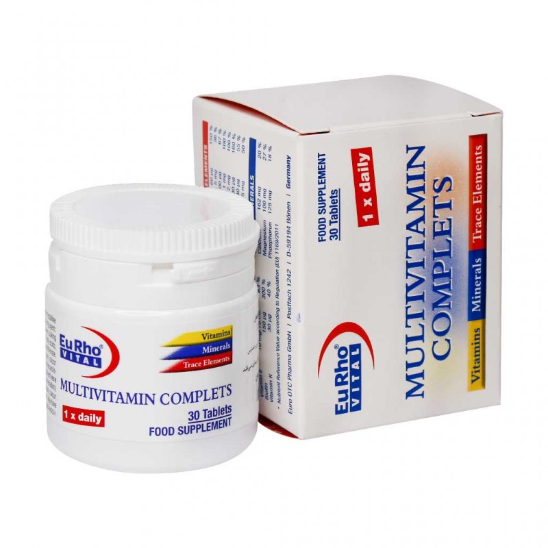 کلسیم هیدروژن فسفات، منیزیم اکساید، مواد پرکننده میکرو کریستال سلولز، پتاسیم کلراید، اسید آسکوربیک (ویتامین C)، ویتامین E، نیاسین آمید (B۳)، فروس فومارات II (آهن)، عوامل پوشش دهنده کراس کارملوز سدیم، عوامل پخش کننده، منیزیم استئارات، مواد پرکننده هیدروکسی پروپیل متیل سلولز، کلسیم – دی – پانتوتنات، ویتامین A، زینک اکساید، منگنز سولفات، بتا کاروتن، رنگ E۱۷۱، سولفات مس، عوامل پخش کننده سیلیکون دی اکساید، سدیم سلنات، کرومیوم کلراید III، پتاسیم یداید، پیریدوکسین هیدرو کلراید (B۶)، کوله کلسیفرول (D۳)، تیامین هیدروکلراید (B۱)، ریبوفلاوین (B۲)، سیانوکبالامین (B۱۲)، گلیسیرین جاذب رطوبت، ویتامین K، رنگ E۱۱۰، فولیک اسید (B۹)، سدیم مولیبدات، دی بیوتین (B۷)، عوامل پوشش دهنده، موم درخت کارنوبا، رنگ E۱۷۲
